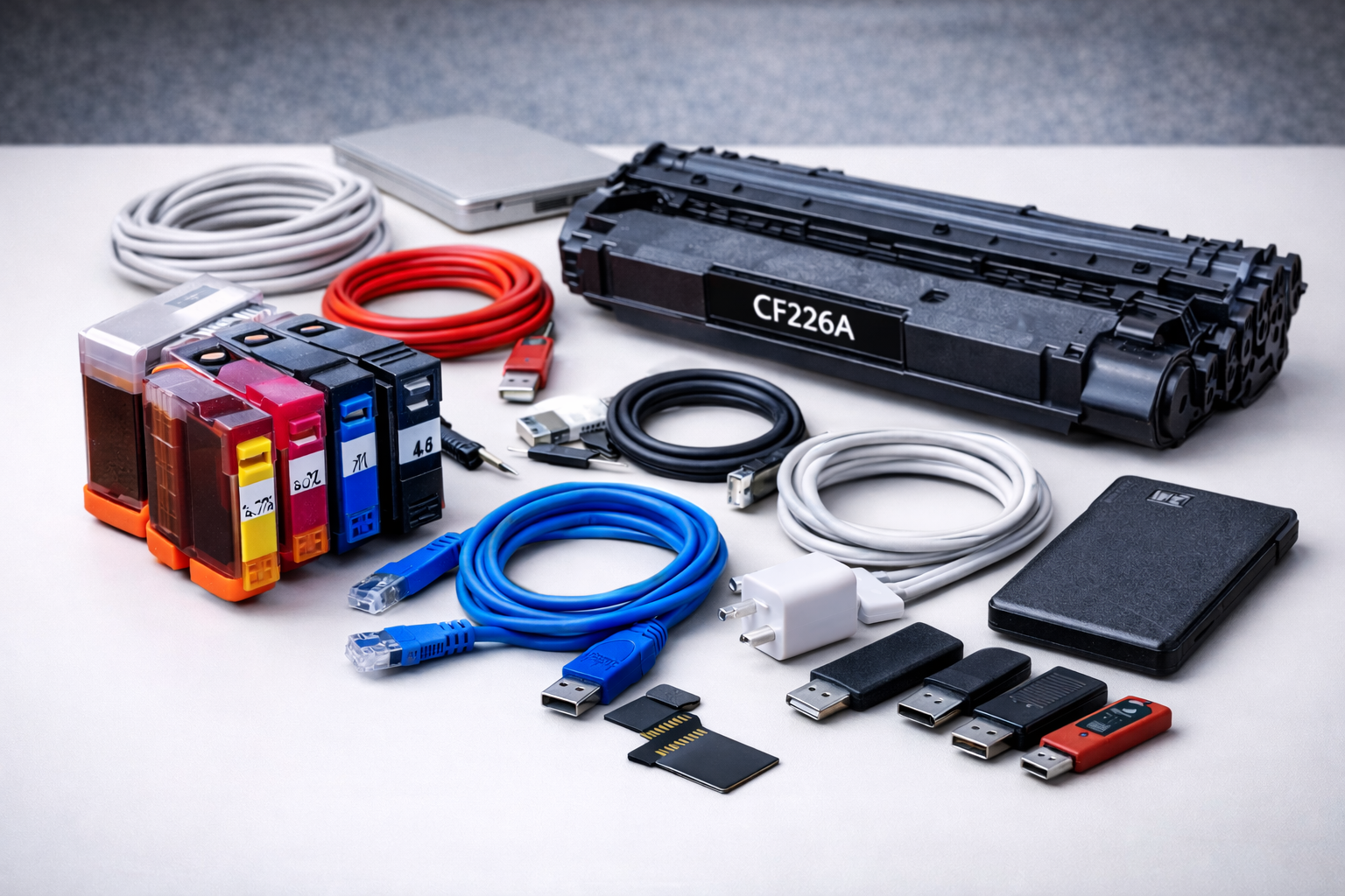 Cables, USB flash drives, storage devices;